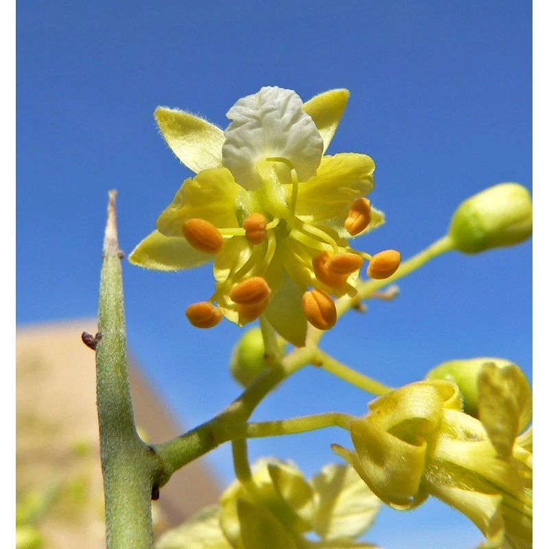 Árbol de tronco erecto con corteza rugosa de color gris verdoso. Las ramas principales son ascendentes, tortuosas y con espinas, las ramas secundarias son colgantes.
