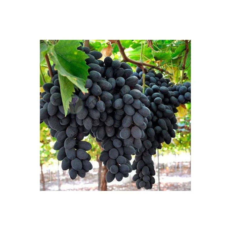 Fruto: Es la variedad de uvas sin pepita de mayor tamaño. Color negro y pulpa crujiente. Maduración: A mediados del mes de agosto.